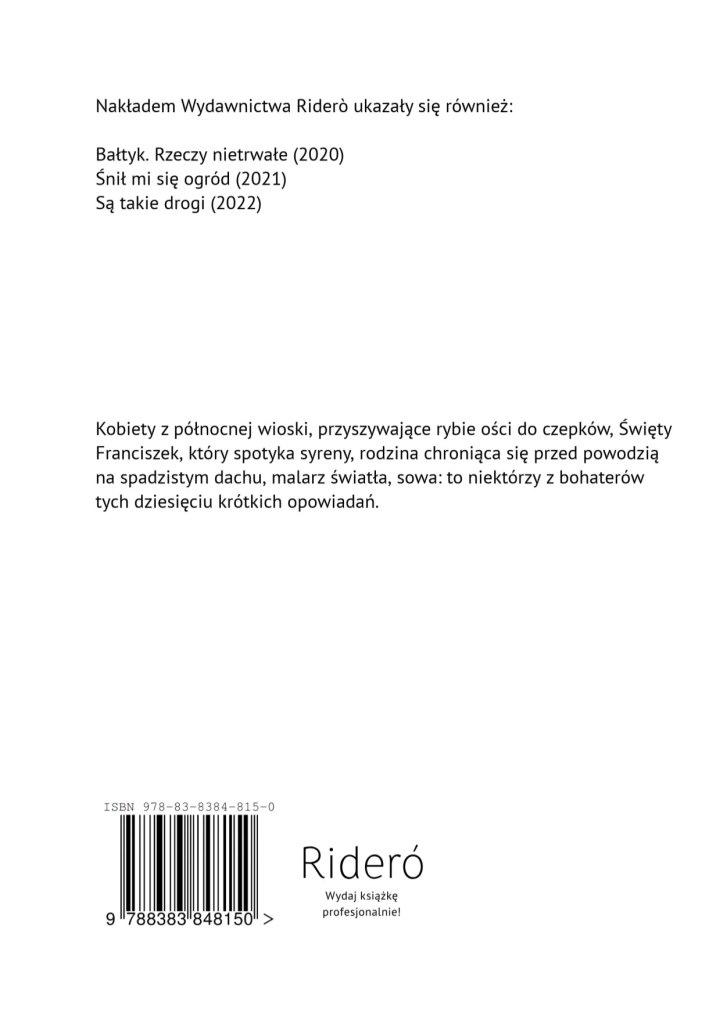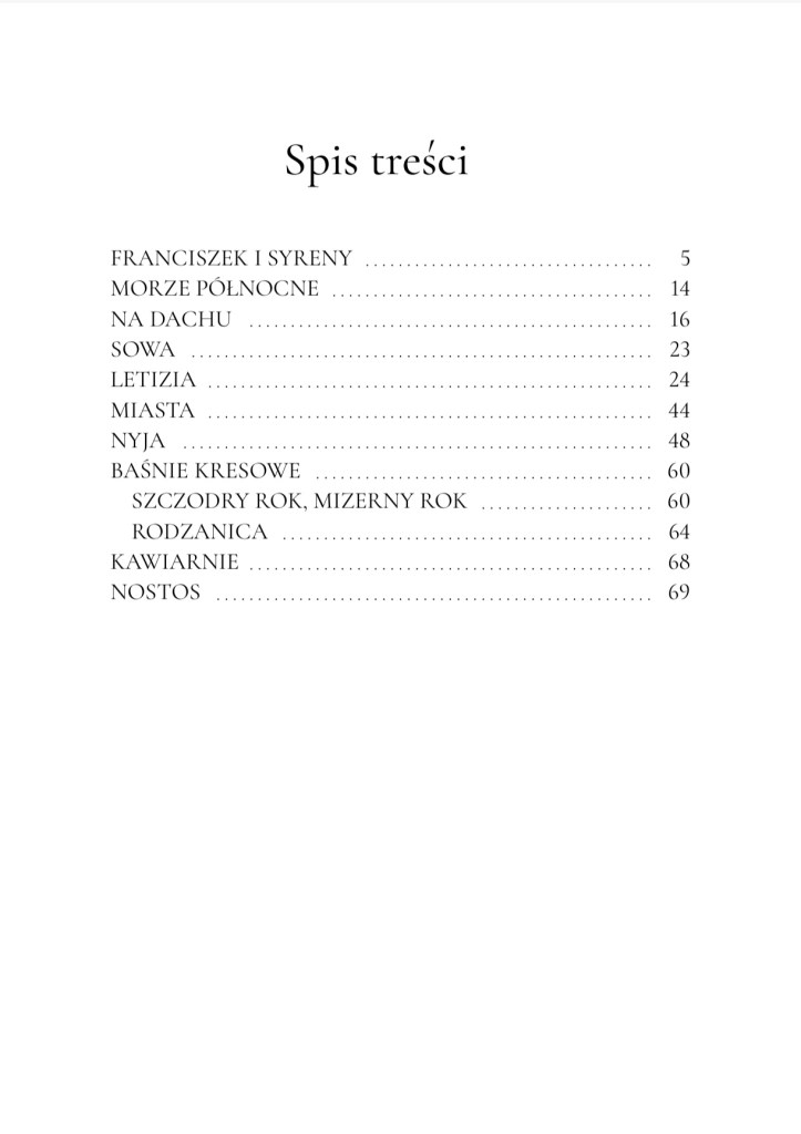 Książka, którą wypuszczam dziś w świat, to zbiór dziesięciu opowiadań, dawnych i zupełnie nowych, powiązanych silną, choć niewidzialną nicią. Zebrałam w nich historie, które są dla mnie ważne w tym momencie życia. Tomik rozpoczyna legenda o Świętym Franciszku, który podczas samotnego pobytu na wyspie spotyka syreny, mieszkające w jeziorze. Drugie opowiadanie, tytułowe, mówi o kobietach, przyszywających do czepków perły z rybich ości. W kolejnych historiach pojawia się rodzina, uciekająca przed powodzią na dach, sowa, o której opowiedział mi pewien kucharz, siostra zakonna, spędzająca kilka letnich dni na włoskim wybrzeżu, przewodniczka z grupą zwiedzających, a po nich dziewczyna malująca pejzaże na kamieniach i siostry ormiańskiego artysty. W książce znajdą się też dwie baśnie kresowe o Nowym Roku.